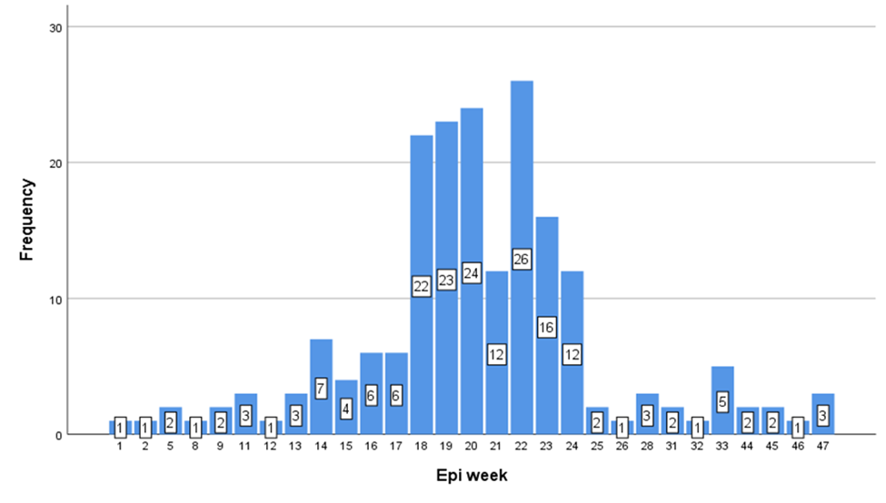 Most of the cases were adult males aged 30–59 years, which was similarly observed in outbreak investigations in India 2021(5). The reason for this may be that most males of this age spend much of their time outside the home—whether at work, shopping, or attending to other needs—resulting in greater exposure and a higher risk of dengue fever infection.